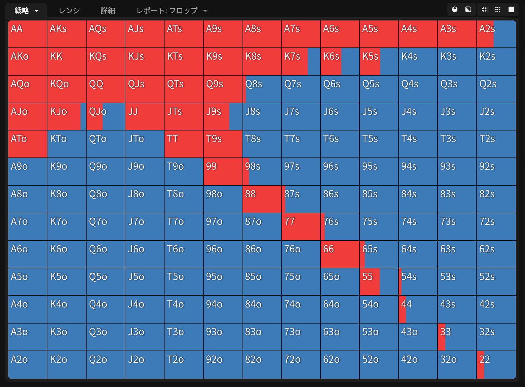 13×13のマトリックス形式で表示されています。ここで、レンジ全体の戦略や、簡単な設定によって、EVや勝率といった項目も同時に確認可能で、個別に特定のハンドを選択すると、そのハンド単体の戦略なども確認することができます。