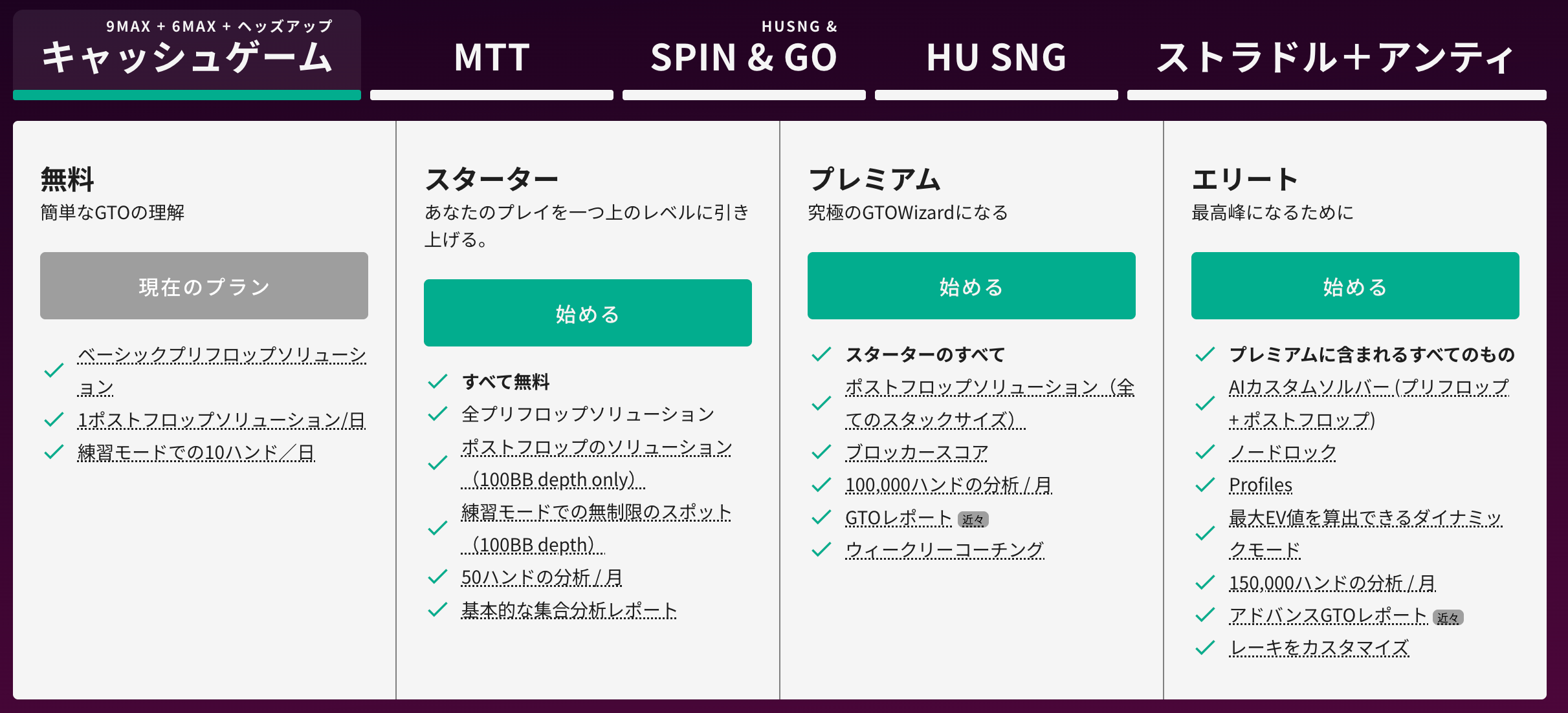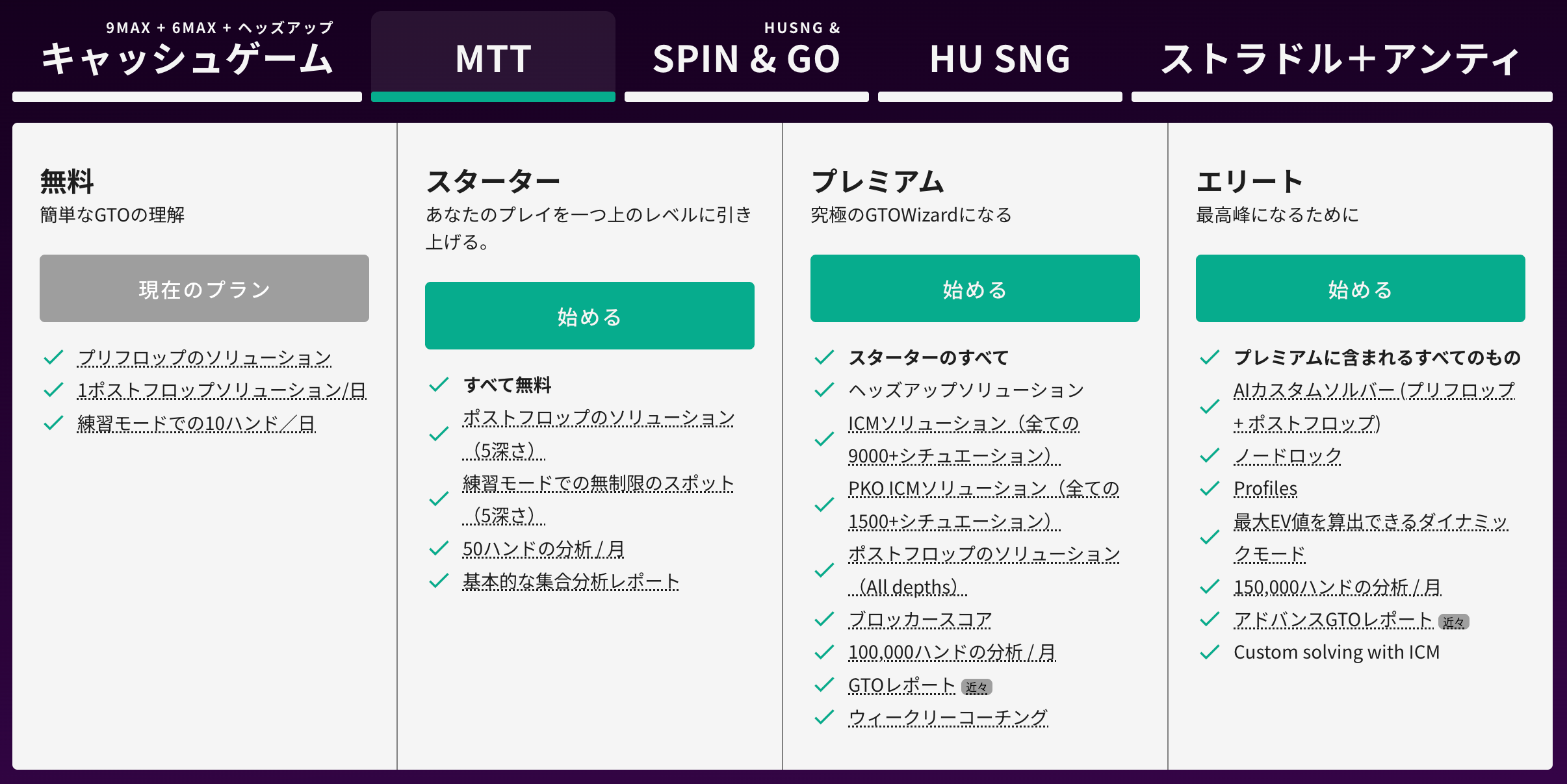 GTO Wizardには複数のプランが用意されており、自分のポーカーレベルや学習目的に合わせて選択することが重要です。基本的には、キャッシュゲームか、MTT(トーナメント)を選択するプレイヤーの割合が多いと思います。