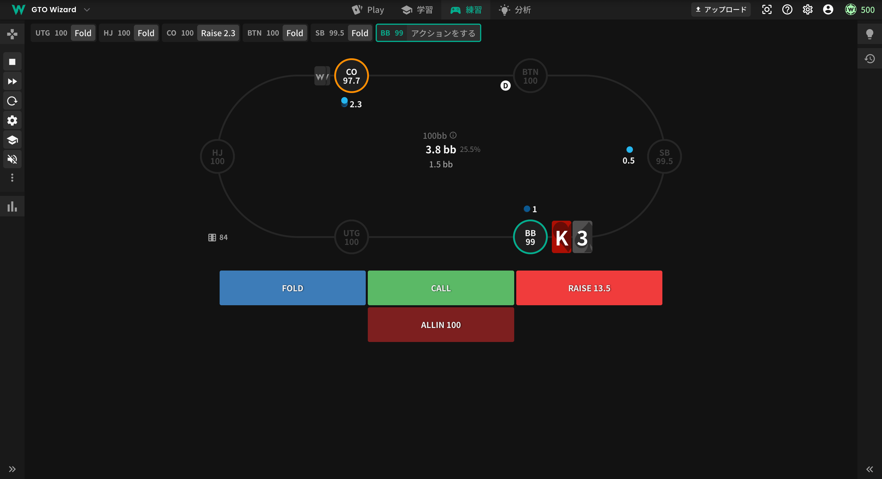 実際のハンド例を使って、GTO Wizardの学習機能を見てみましょう。