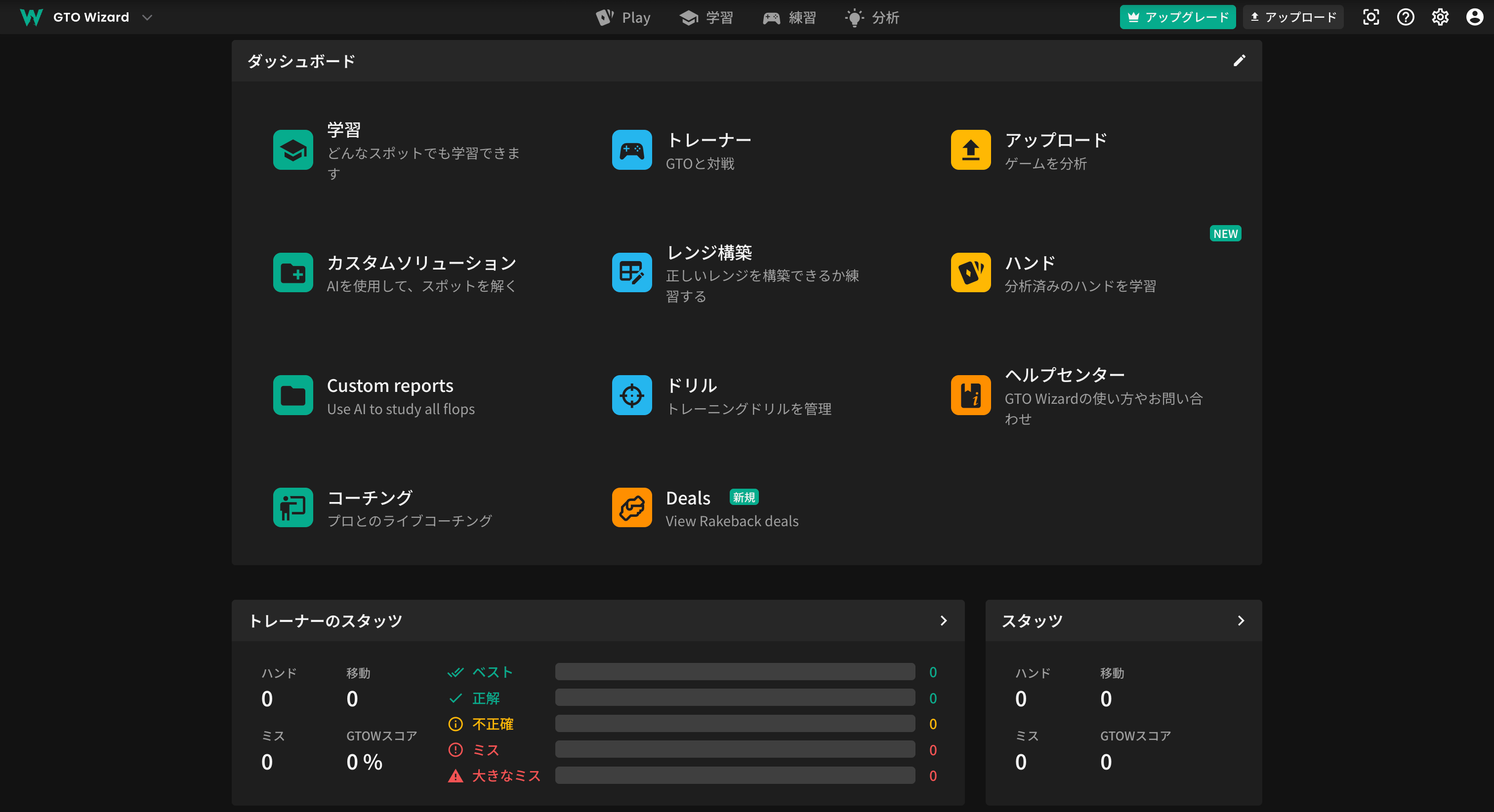 これがPCで見た時のGTO Wizardのダッシュボード画面です。流石に全部触れるには、機能が多すぎるので、今回は、主要機能である、学習機能とトレーナー機能で出来ることと、使い方を紹介します。この二点の使い方を抑えるだけでも、十分に学習を深めることが可能です。