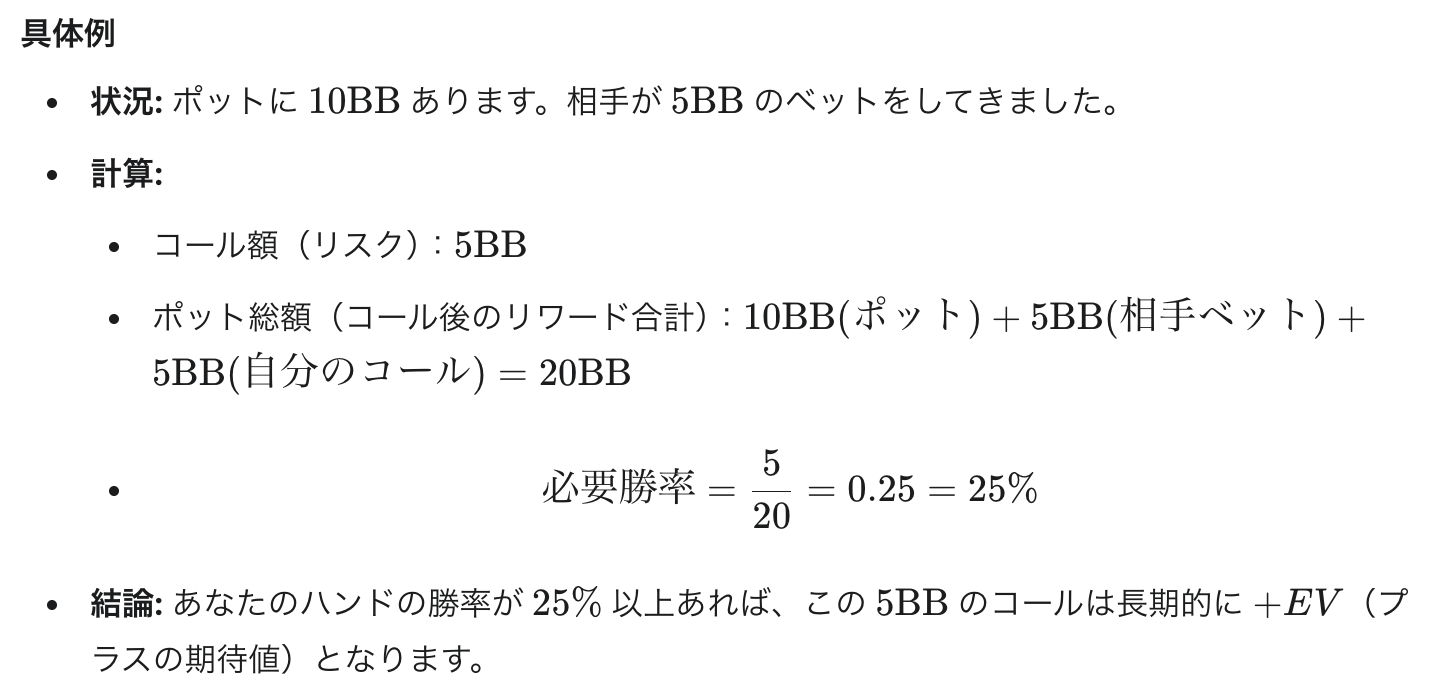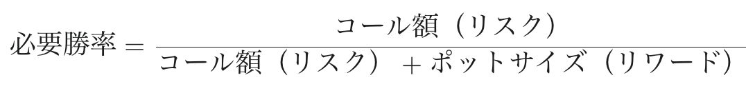 この式は、「現在のポット」と「相手のベット額」を加えた「ポット総額」に対して、「コールに必要な額」が占める割合を示しています。
