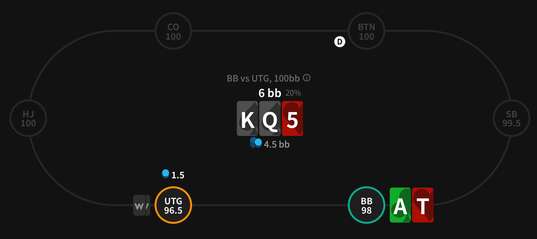 この場合、4.5BBのポットに、1.5BBのBetを受けているので、コールするのに必要な勝率は、これから自分がコールする場合に必要な1.5BBと、既に相手が投入している1.5BB、そして4.5BBのポット額を足すと7.5BBです。その場合、1.5BB÷7.5BB=0.2 となる。これをわかりやすく%にするために100を掛けると、20%ということになります。