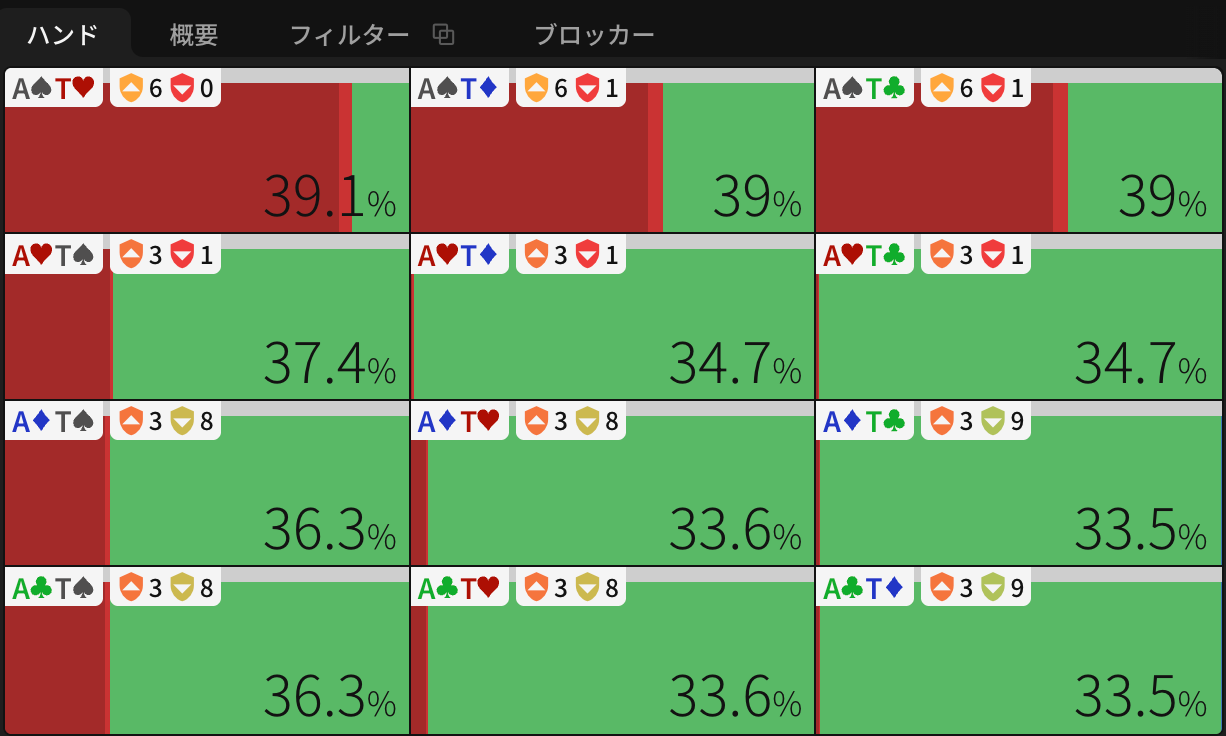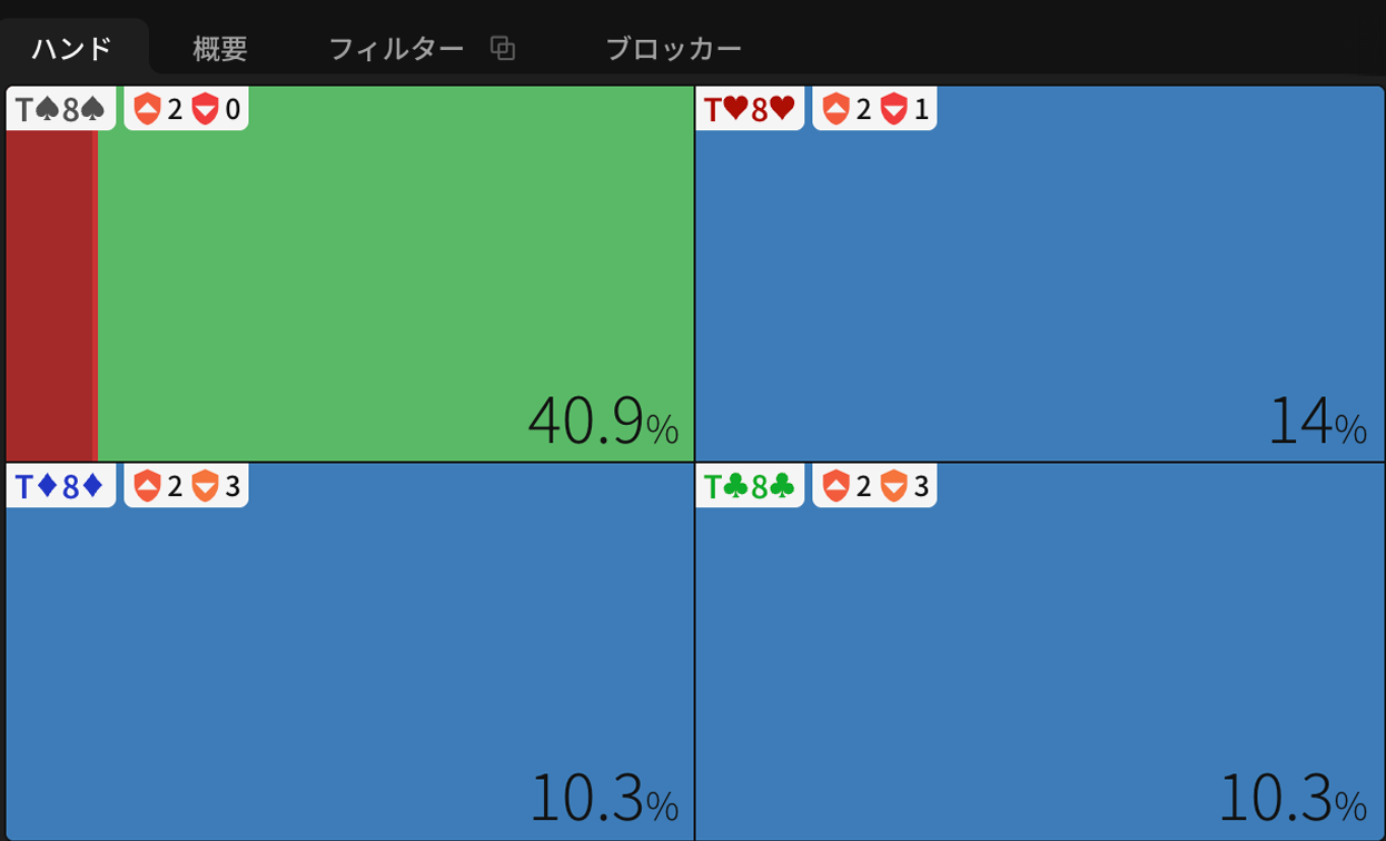 また、T8sのようなハンドのEQ(勝率)を見てみると、フラッシュドローであれば、ターン以降でフラッシュになる可能性があり、それが勝率を上げる要素となっているので、ディフェンスが許されていますが、その他のハンドは一応勝てるEQは保持しているものの、必要勝率20%に満たしていないようなハンドは、フォールドしています。